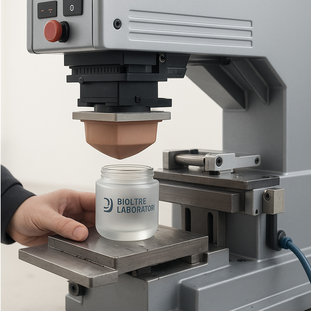 Siamo dotati di un impianto semi-automatico di tampografia da 1 a più colori. È perfetta per personalizzare tappi, superfici curve e colplesse e piccoli accessori cosmetici con loghi o elementi decorativi.